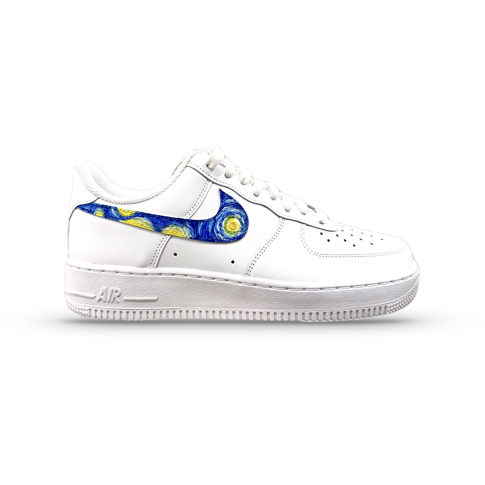 Inspirado en la magia de Starry Night de Van Gogh, Nocturne Étoilé transforma un clásico Nike Air Force 1 blanco en un lienzo vivo de arte portátil.
